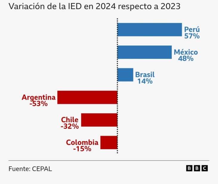 Mientras varios países de América Latina celebran un incremento en la llegada de capitales del exterior, Argentina se ubica en el extremo opuesto del ranking. Según datos de la CEPAL publicados por BBC Mundo, nuestro país registró en 2024 una caída del 53% en la Inversión Extranjera Directa (IED), siendo el de peor desempeño de la región.