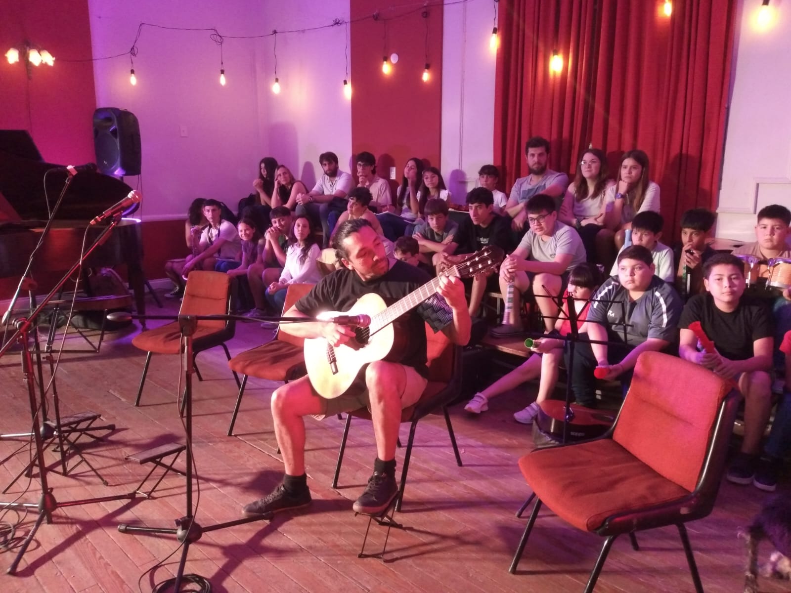 Las alumnas y los alumnos, junto con sus profes, fueron presentando sus producciones en violín, piano, percusión, guitarra, flauta traversa, ukelele, saxofón y práctica coral; en sus distintos niveles de lenguaje musical.
