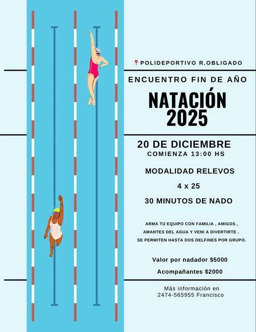 Para coronar un año sumamente positivo los amantes de la Natación están organizando para el próximo sábado un gran encuentro de la disciplina, el cual se estará llevando a cabo en la vecina localidad de Rafael Obligado, más precisamente en la pileta del complejo Polideportivo.