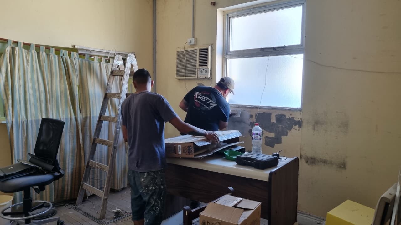 En esta oportunidad las obras se concentran en las oficinas de Dirección y Administración. En una primera etapa se realizó el recambio del techo de tejas y, posteriormente, se avanzó con mejoras en el interior: colocación de nuevos cielorrasos y pintura de paredes.